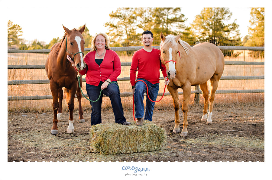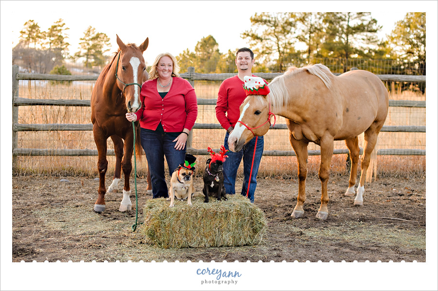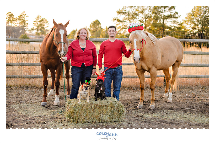 I was SO stinkin’ excited when Jill told me her friends Kristen and Eric wanted to do a mini session and wanted to know if it was OK if we did it on their property – which is a farm. They dressed up their horses and dogs with Christmas hats and HOLY COW THE CUTE! So much fun! We also managed to be there right at the golden hour and it was beautiful!