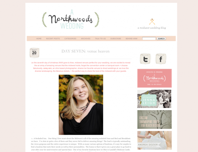I can’t recall how I found out about A Northwoods Wedding but I know one thing, I’m smitten! They feature only midwest weddings and I know I’ve heard quite a few of my clients mention that it’s SO hard to find weddings on some of the wedding blogs that are midwest and not all beachy or big city. I was asked to be a part of their “12 Days of Christmas” feature and I got to write about one of my favorite parts of the wedding, venues!!! I chose 7 unique venues you’ll find in the midwest and featured images of Landoll’s Mohican Castle, Stan Hywet, Jilbert Winery, Holden Arboretum and Culinary Veggie Institute.